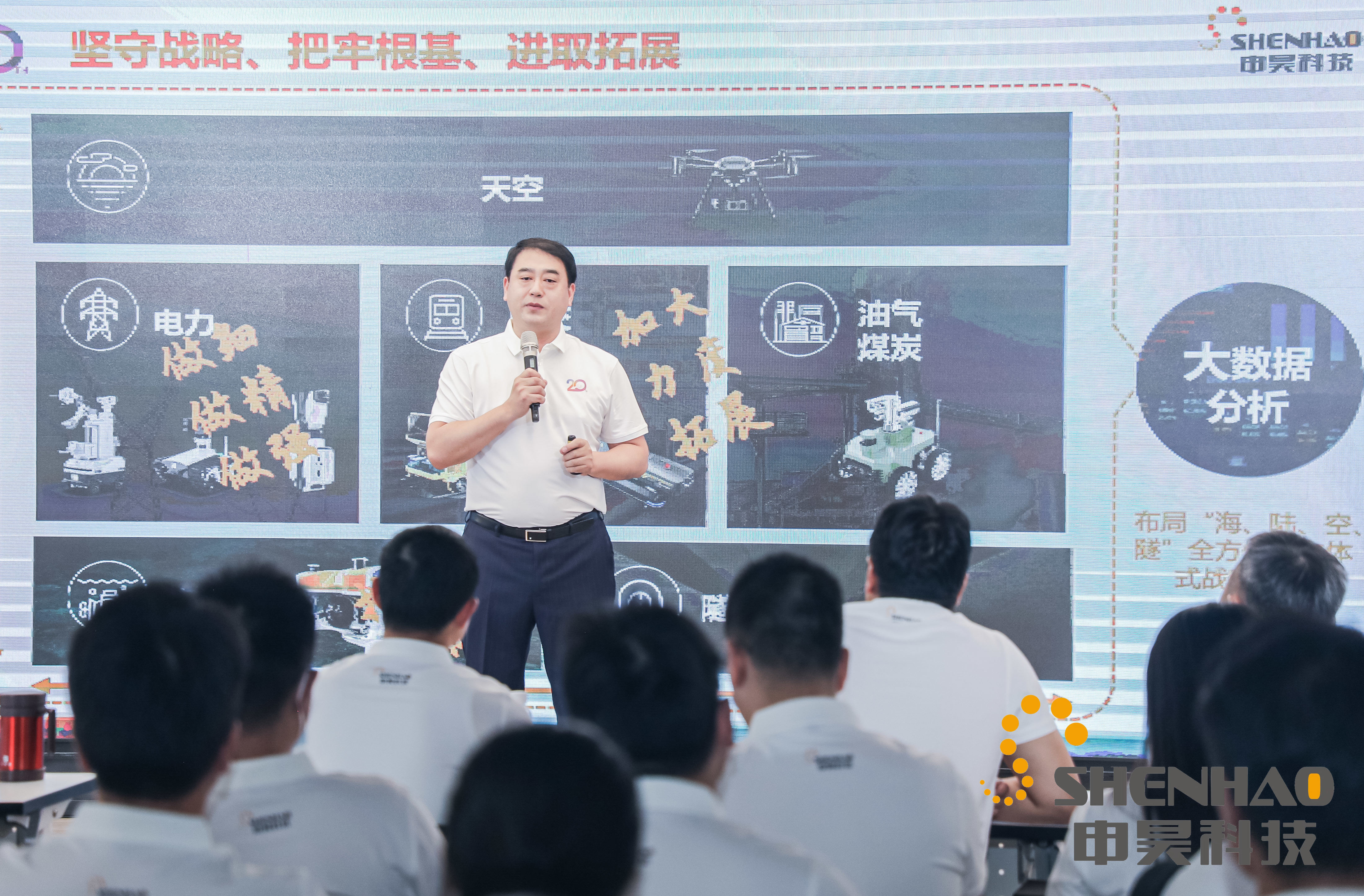 陳如申董事長發(fā)表致辭,他表示,申昊科技創(chuàng)業(yè)廿載,跟隨國家的路線,堅守國家發(fā)展戰(zhàn)略規(guī)劃,一步一個腳印,逐步壯大,從最初的電動車檢測,到電力固定端檢測;再到室外、室內(nèi)的電力、石油化工巡檢機器人;拓展到軌道交通領(lǐng)域的檢測線路的機器人、檢測車底的機器人、檢測剛性接觸網(wǎng)的機器人;發(fā)展至今,產(chǎn)品線正在向著企業(yè)戰(zhàn)略“海陸空隧”各個領(lǐng)域突破。產(chǎn)品線越來越豐富的同時,企業(yè)規(guī)模也在不斷發(fā)展壯大。
